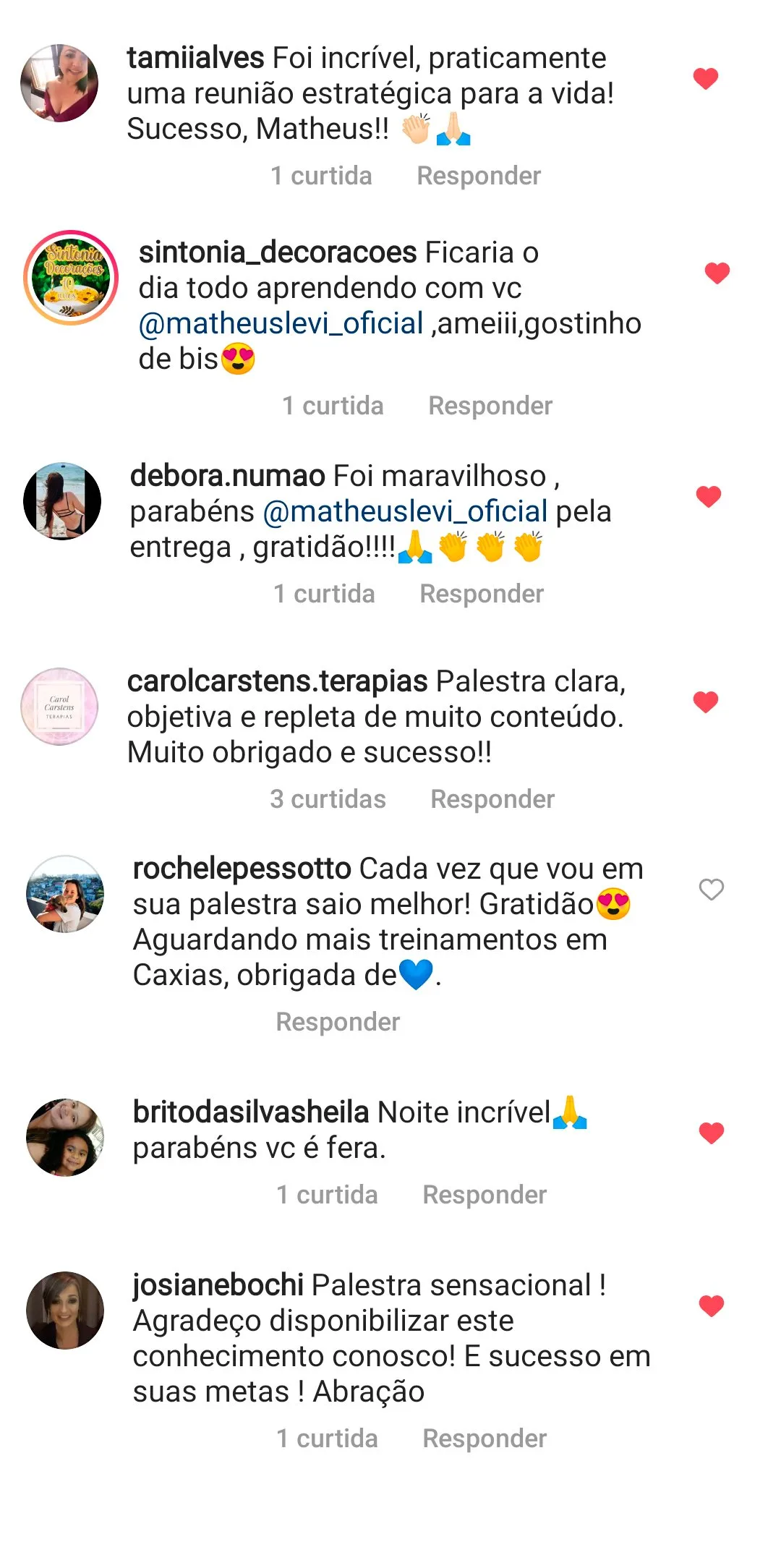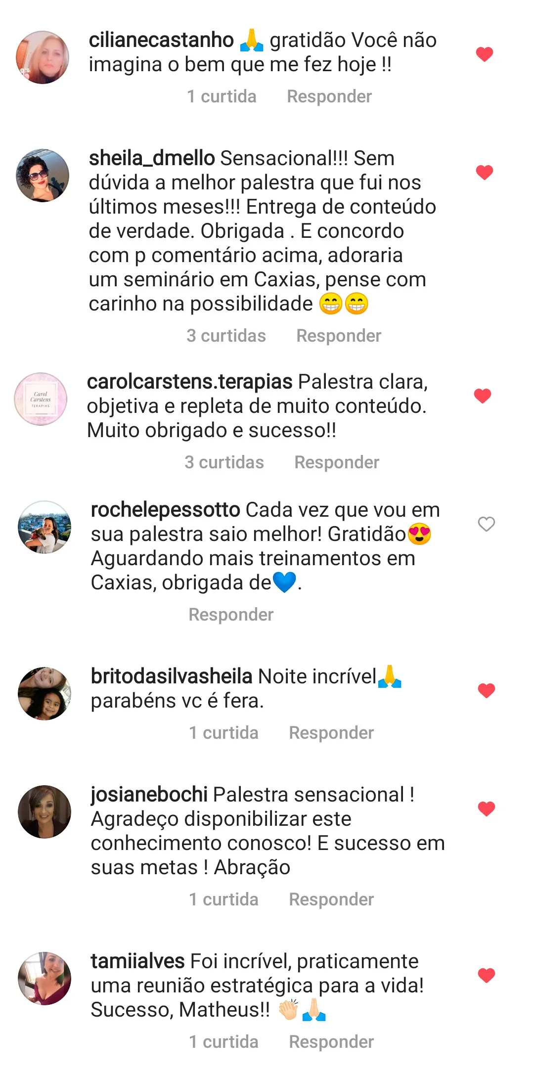 Com Matheus percebi algo diferente, uma espontaneidade e verdade em tudo que diz. Me encantou e me fez enxergar meu potencial como empreendedora. Gratidão pelos ensinamentos!