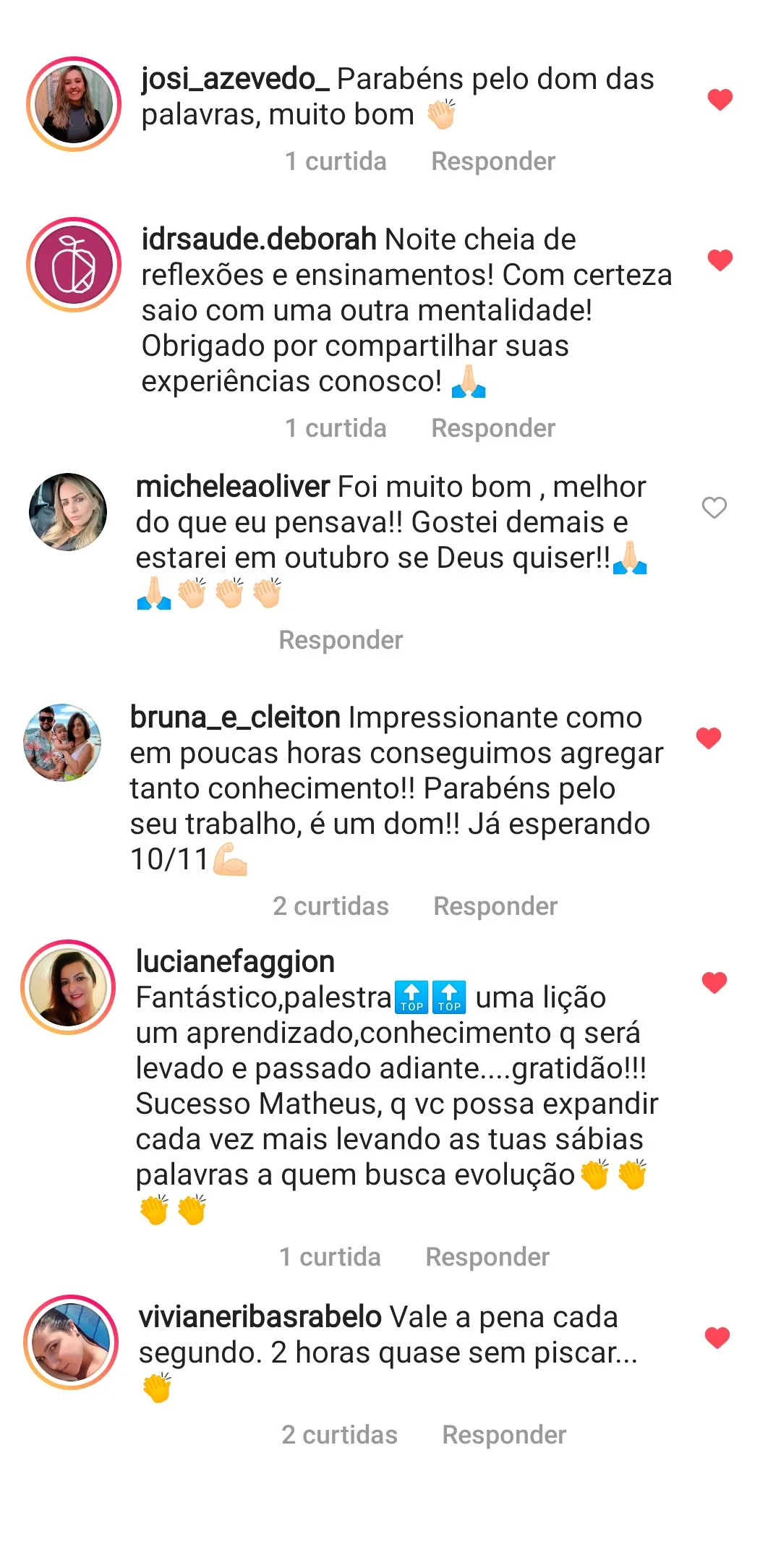 Não é fácil explicar como uma pessoa que não conhecemos, consegue nos descrever tão profundamente assim e extrai de nós coisas que não sabíamos que tínhamos. Posso dizer que ao participar da palestra do Matheus foi possível me redescobrir.
